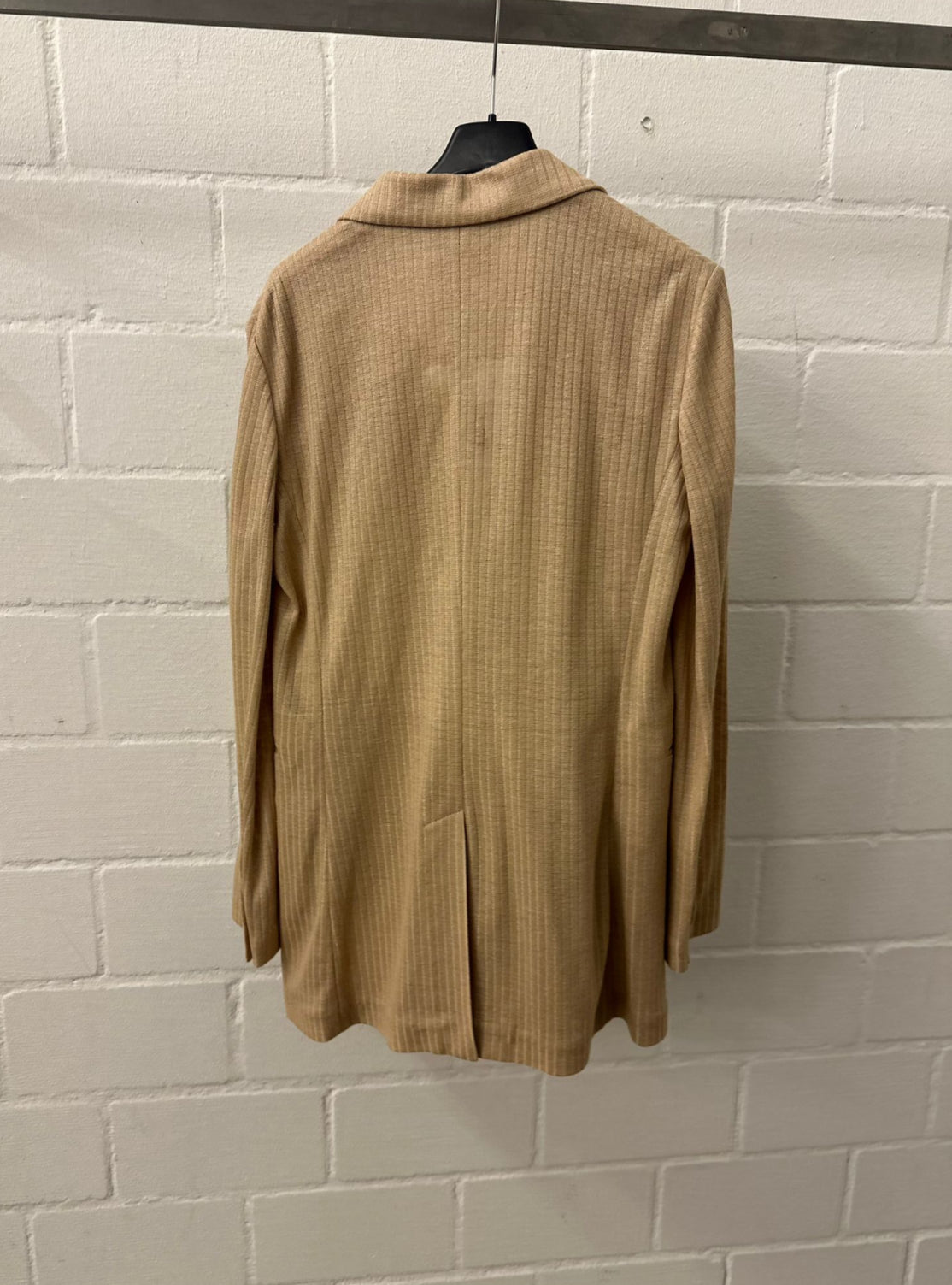 Dieser beige, doppelt geknöpfte Mantel von Circolo vereint klassische Schneiderkunst mit modernem Komfort. Die feinen Nadelstreifen und die goldfarbenen Knöpfe verleihen dem Look eine subtile Raffinesse, während der entspannte Schnitt für mühelose Eleganz sorgt.